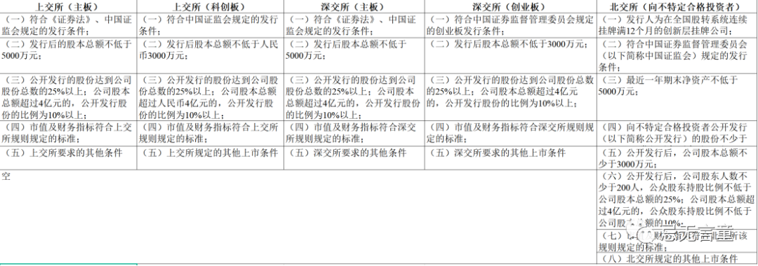 从首次公开发行股票上市的条件看,各板块有所不同。笔者将三大交易所,即上海证券交易所、深圳证券交易所、北京证券交易所各自公布的征求意见稿的内容做了对比,在基础条件上,除了北京证券交易所外,其他两大交易所的规则基本相同,具体见如下: